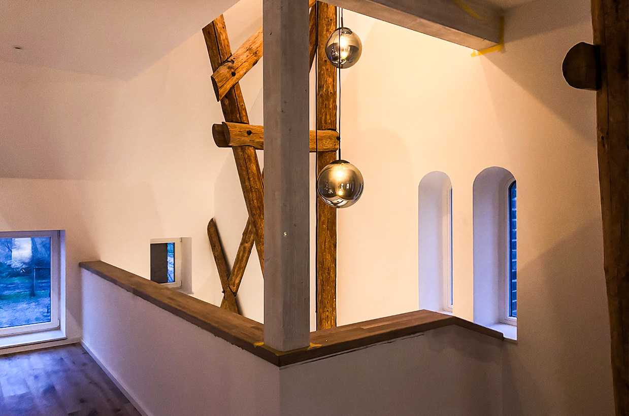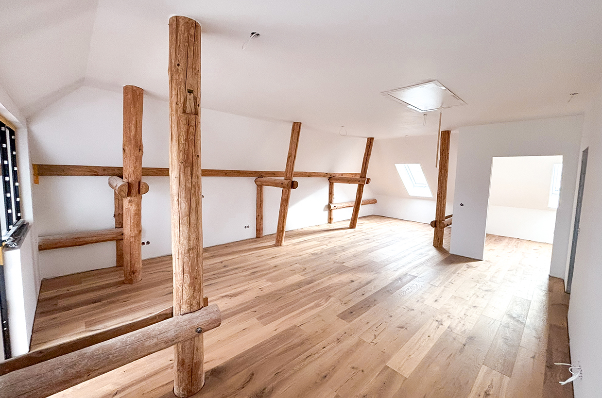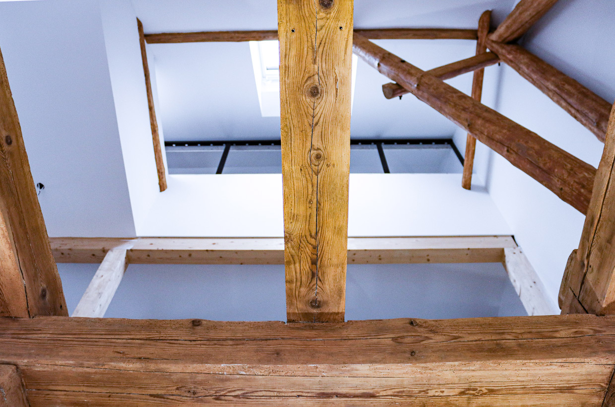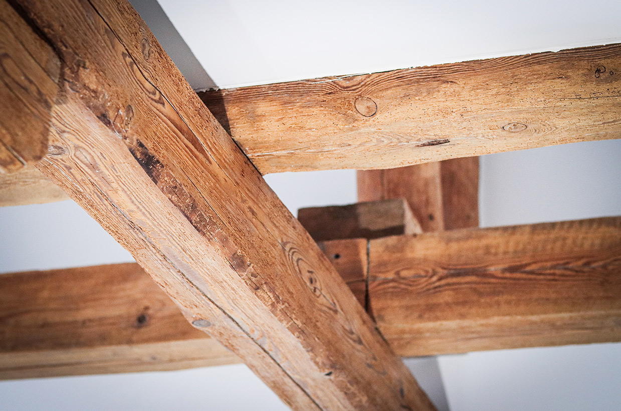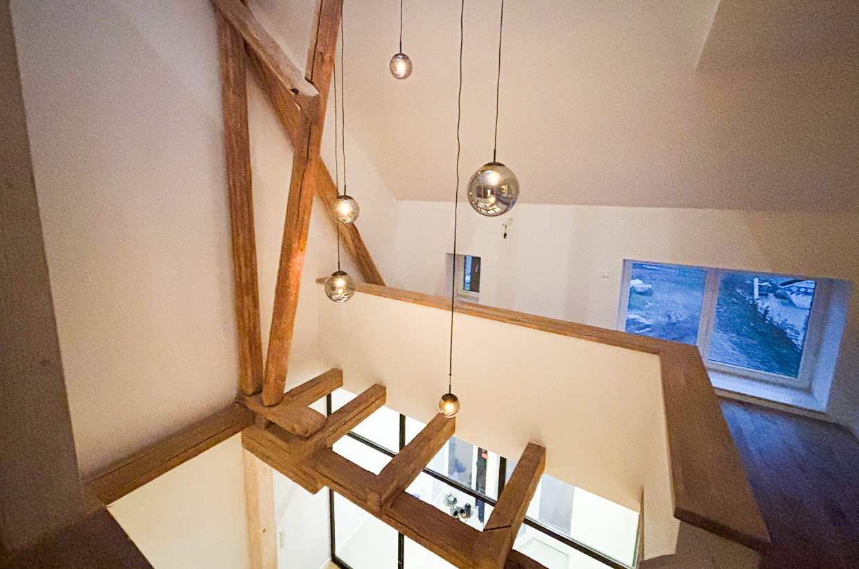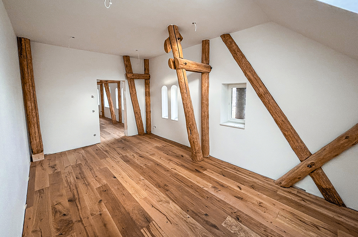 Von den sichtbaren Decken- und Fachwerkbalken in den Wohnbereichen bis hin zur Neuverfugung des gesamten Gebäudes – hier wurden alle Details des historischen Gebäudes sorgfältig restauriert und zu neuem Leben erweckt.