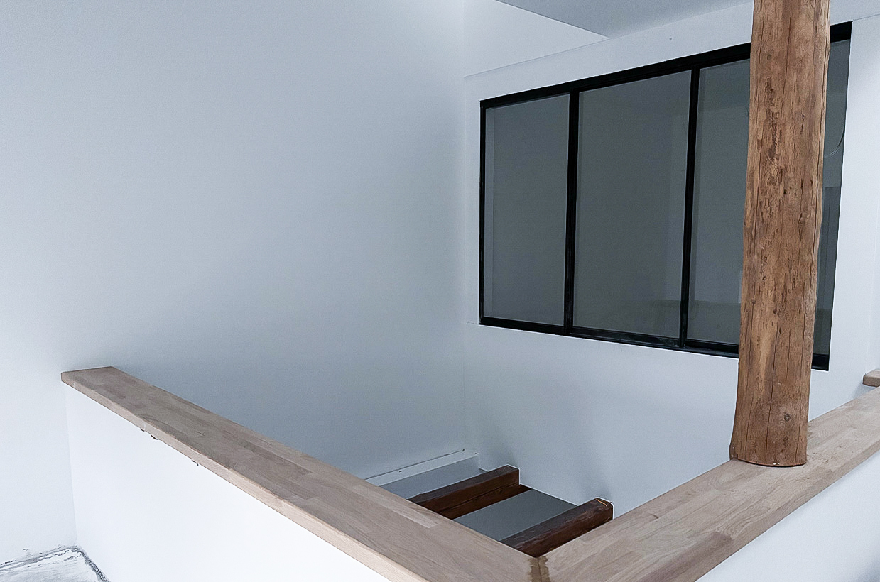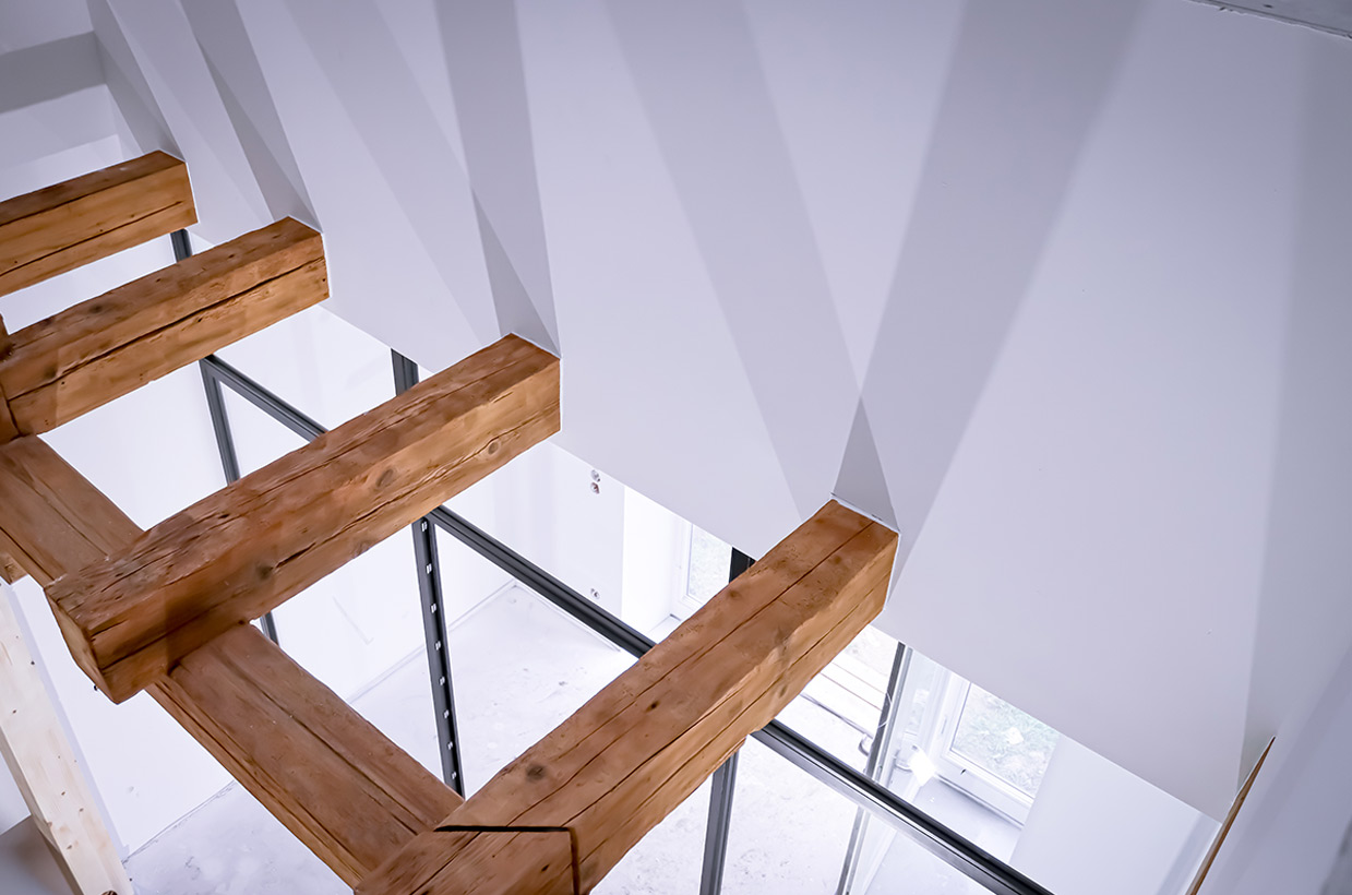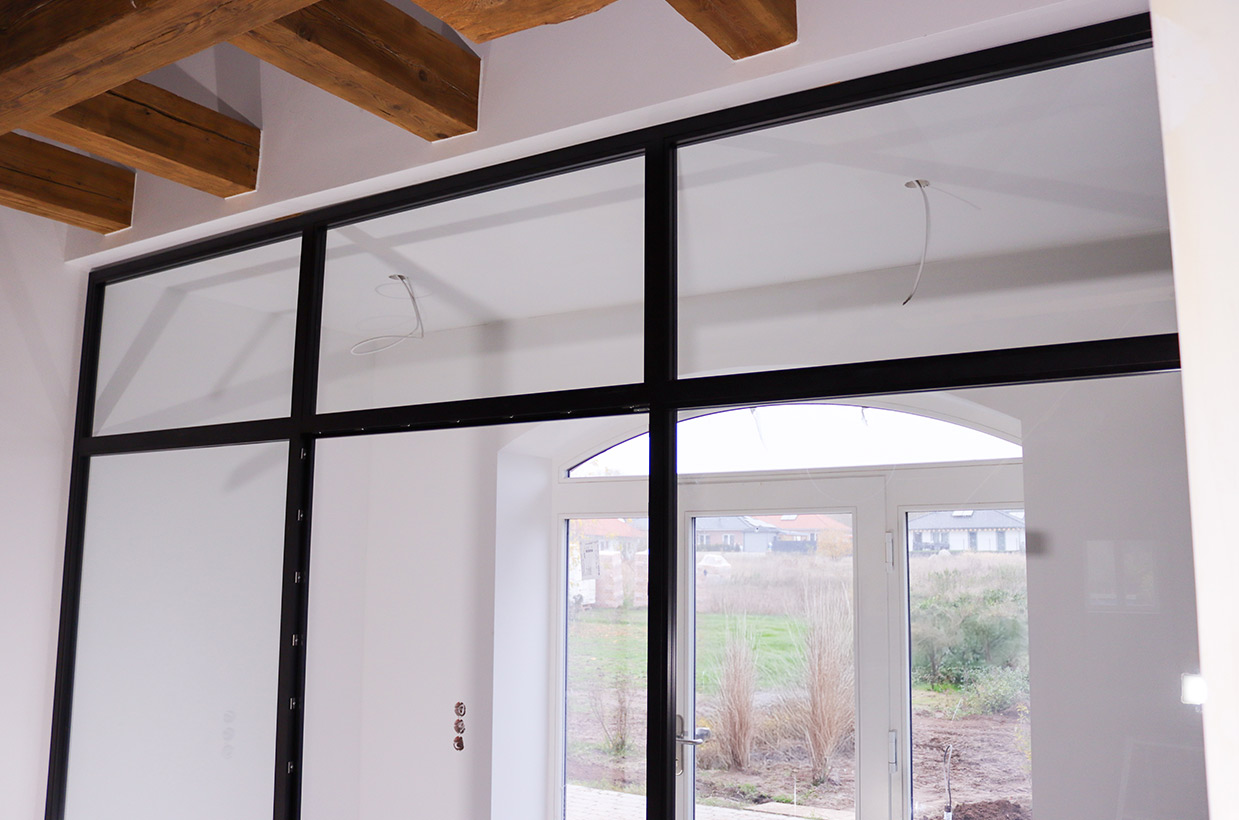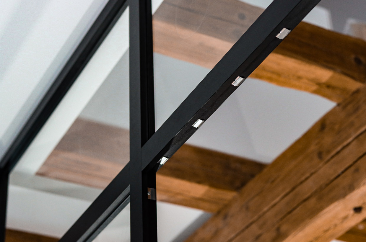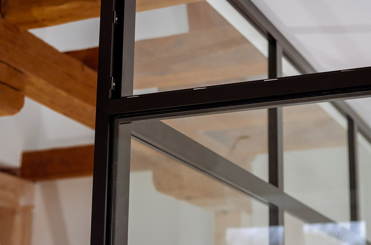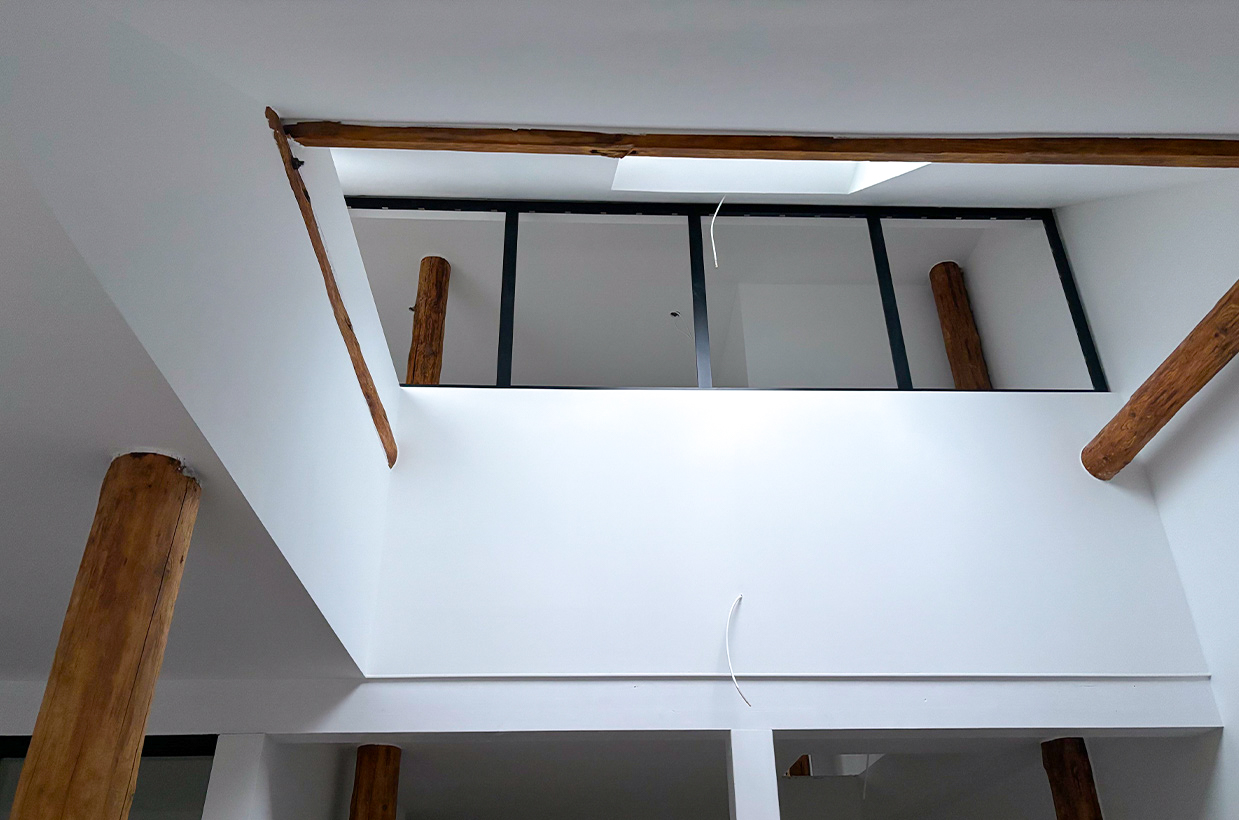 Die Brücke im 1. Obergeschoss verbindet zwei Zimmer und führt zu einem großen bodentiefen Fenster mit Sitzmöglichkeit. Dieser Bereich schafft eine helle, offene Atmosphäre und bietet einen gemütlichen Platz zum Entspannen und Genießen des Ausblicks.