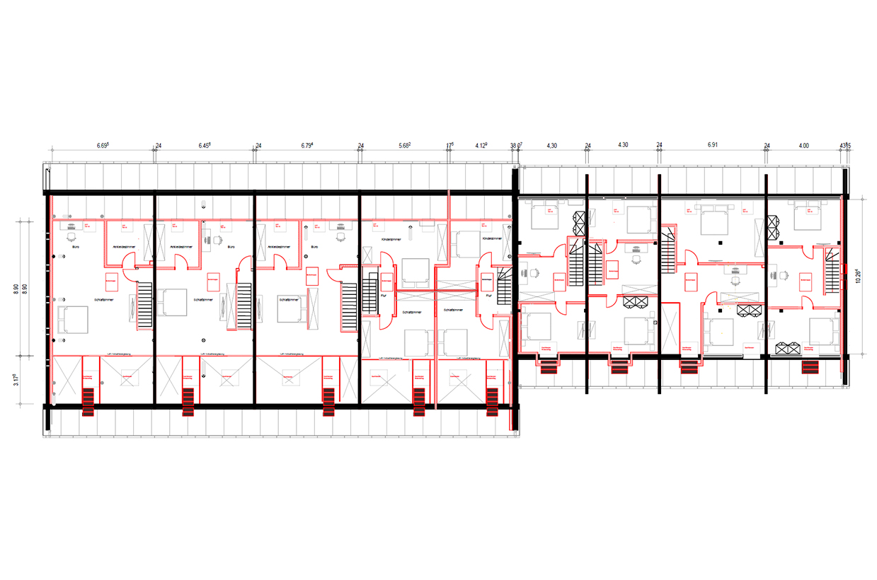 Die Dachgeschosse eignen sich perfekt als Schlafzimmer mit begehbaren Kleiderschränken. Sie bieten zudem ausreichend Platz für einen Büro- oder Arbeitsbereich. Dieser Raum vereint Schlafen, Arbeiten und Stauraum in einer komfortablen, privaten Umgebung.